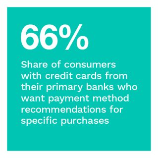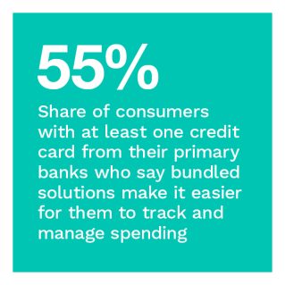 • Fifty-one percent of consumers with credit cards from their primary banks are interested in having all their spending accounts at a single FI. The appeal of bundled accounts among consumers who have credit cards with their primary banks suggests that banks can increase the overall value of their relationships with these customers by offering bundled solutions.