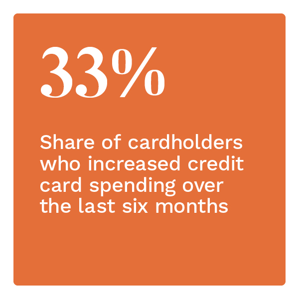 • The more impact consumers feel from inflation, the likelier they are to use credit cards for large shares of their spending. This also makes it more likely they will end up with revolving balances.