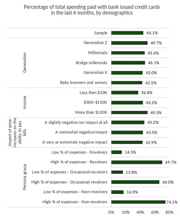 Across all demographics, Gen Z’s 50% of their total spend being put on a bank-issued credit card during the period represents the highest use across demographics.