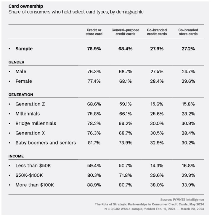 Thirty-eight percent of consumers earning more than $100,000 a year have a co-branded credit card, and 34% have a co-branded store card, compared to just 14% and 17%, respectively, for those annually earning less than $50,000. Approximately 30% of those earning between $50,000 and $100,000 own co-branded and store cards.