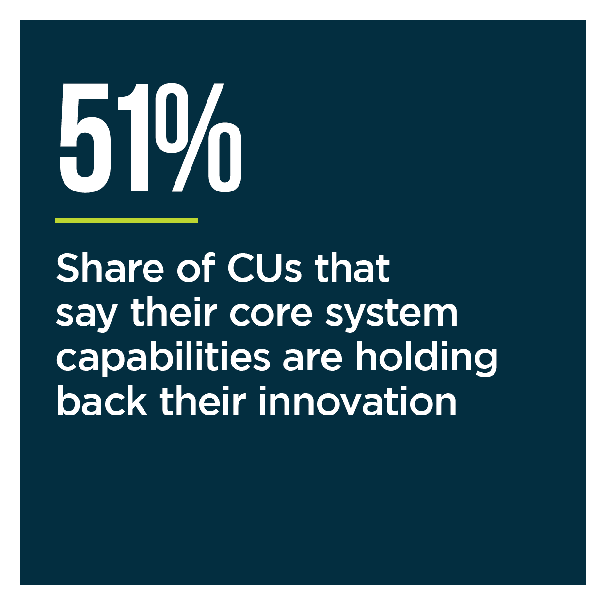 There are nevertheless several key hurdles that CUs must still overcome to realize their full innovation potential, with limited technical capabilities being at the top of the list. Sixty-three percent of CUs say they lack the data analytics capabilities they need to create personalized member products, and 51 percent say their core systems’ capabilities do not allow them to innovate the types of products needed to meet members’ expectations.