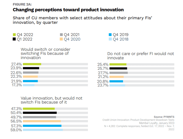 Time may be of the essence. As the chart below shows, 27% of CU members say they would switch where they keep their financial accounts to find product innovation. That’s up from the 17% of CU members who were willing to do the same as recently as 2018.