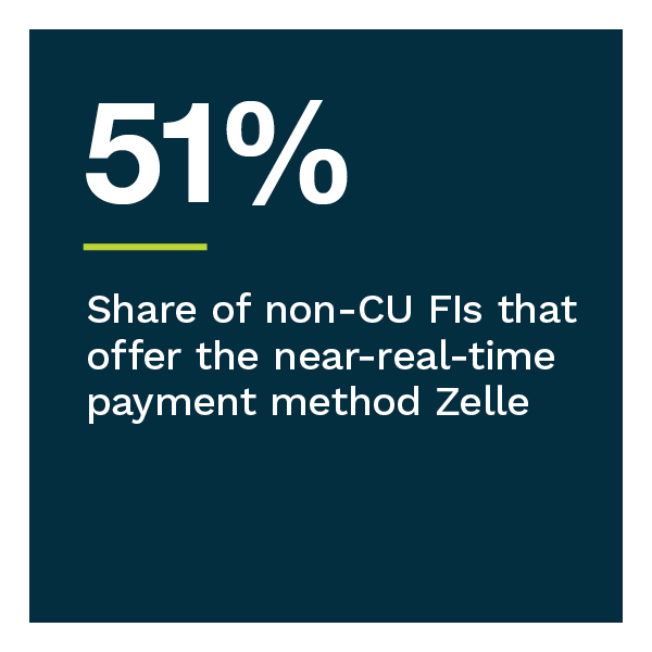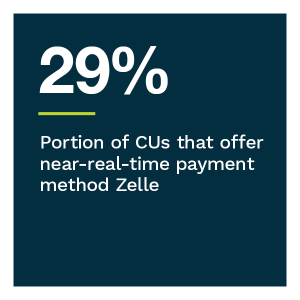 CU members report using as many payment methods as the average bank account holder but tend to use more traditional methods, such as checks, credit cards and debit cards. These consumers would rather have new digital payment innovations that other FIs provide. CU members CUs are much less likely to offer members contactless card options or Zelle, a real-time payment solution.