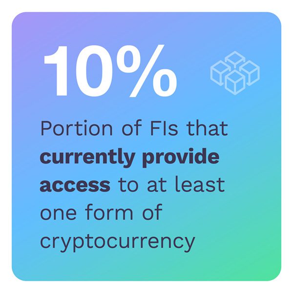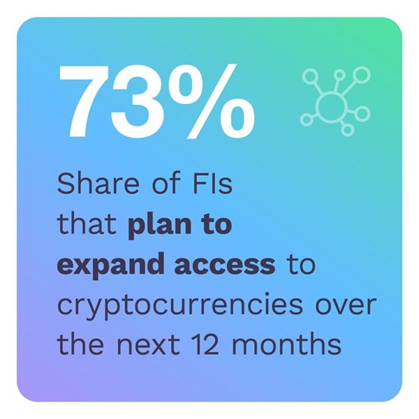 Our research reveals that cryptocurrency and blockchain have certainly caught the attention of conventional FIs like banks. While just 10 percent of FIs provide access to cryptocurrencies, nearly three-quarters plan to expand access to them over the next 12 months. At the same time, banks do not appear to fully appreciate the nature and scope of their corporate and institutional customers’ interest in blockchain-based currencies and financial tools.