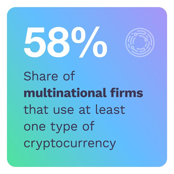 The nature of operating in multiple geographies appears to be a major driver of adoption. The more geographies in which a firm does business, the more likely it is to use cryptocurrencies. These digital assets offer the potential for a near-instant means of moving money, without the frictions that have long plagued cross-border payments, including hefty fees and limiting banking hours and regulations.