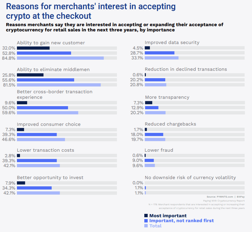 The survey found that 85% of merchants say the ability to gain new customers is a reason for their interest in accepting crypto at the checkout, and 82% say the same about the ability to eliminate middlemen.