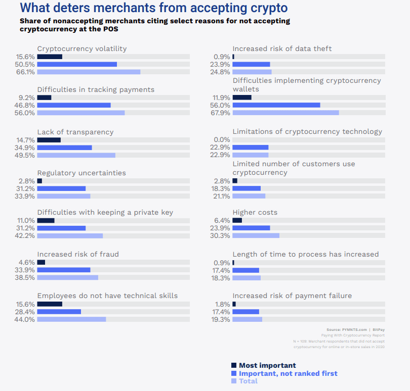Some of the key factors preventing merchants from accepting cryptocurrency are difficulties implementing cryptocurrency wallets, cryptocurrency volatility and difficulties in tracking payments. These reasons are cited by 68%, 66% and 56%, respectively, of the merchants that do not accept crypto.