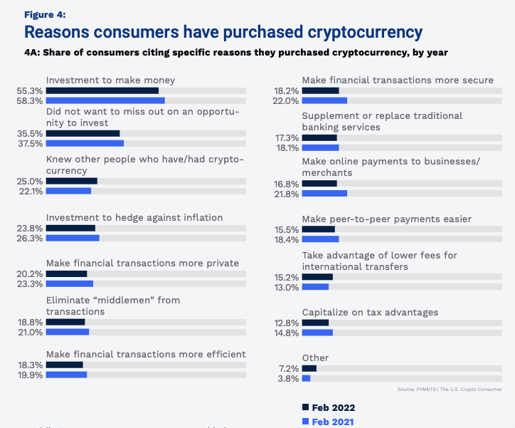Serving the crypto consumer starts with understanding who they are and why they got in. According to the report, although the share of U.S. consumers who currently own cryptocurrency has grown in the past year, the reasons they purchase it have remained the same: They see it as an investment, not a payment method.