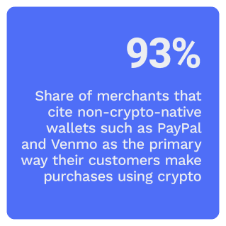 • Forty-six percent of merchants say they have integrated crypto into their mix of accepted payments, although just 23% report accepting payments via crypto-native wallets. Most cryptocurrency purchases are made with digital wallets like PayPal and Venmo that allow other payment methods and are non-native crypto payments.