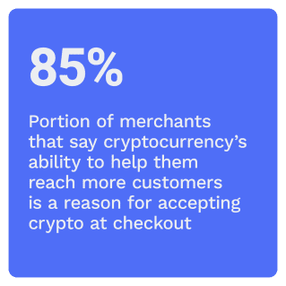 • Ninety-five percent of the businesses that currently accept cryptocurrency as a form of payment say they are planning to innovate or further innovate their crypto acceptance capabilities. Merchants want to expand the capabilities of their payments platforms to be integrated with cryptocurrency as a payment method.