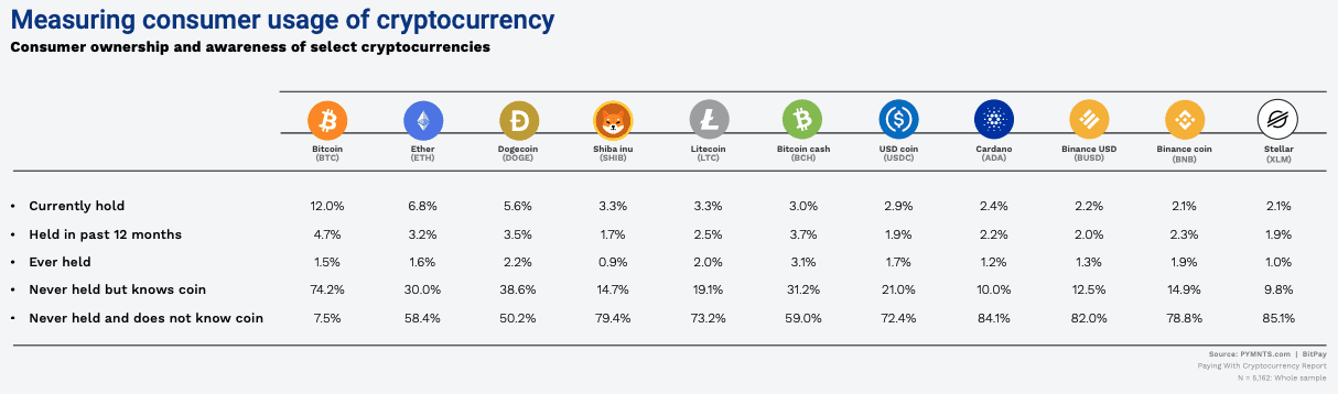 “The share of consumers holding cryptocurrency for use as a payment method has grown,” the study stated. “Sixteen percent of consumers currently own some cryptocurrency, compared to 12% a year ago. Bitcoin remains the most popular digital currency and was held by 12% of consumers surveyed. Ether is the next most popular digital currency, and it was held by 6.8% of consumers surveyed.”