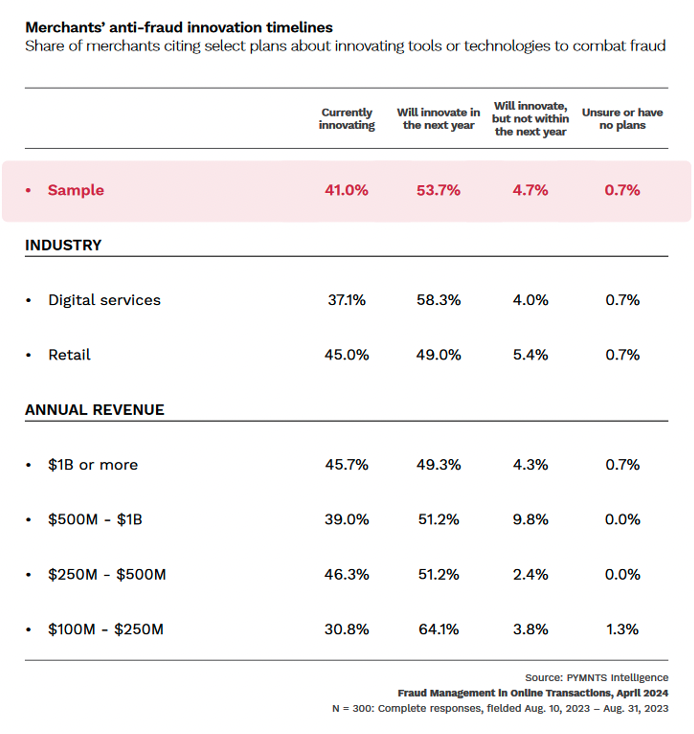 How much revenue an eCommerce merchant generates appears to correspond to their eagerness to enhance their fraud-prevention measures. Merchants generating between $100 million and $250 million in annual revenue, the smallest in the sample, are behind the curve, with 31% upgrading their anti-fraud systems, although 64% plan to innovate in the next 12 months.