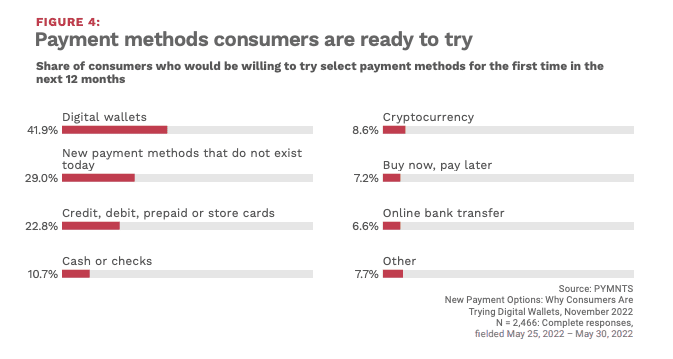 Per the study, “Few consumers appear willing to try specific payment methods with which they are unfamiliar. Less than 23% of consumers we surveyed had an interest in trying any given payment method they had not used before, except for one. The lone exception is digital wallets.”