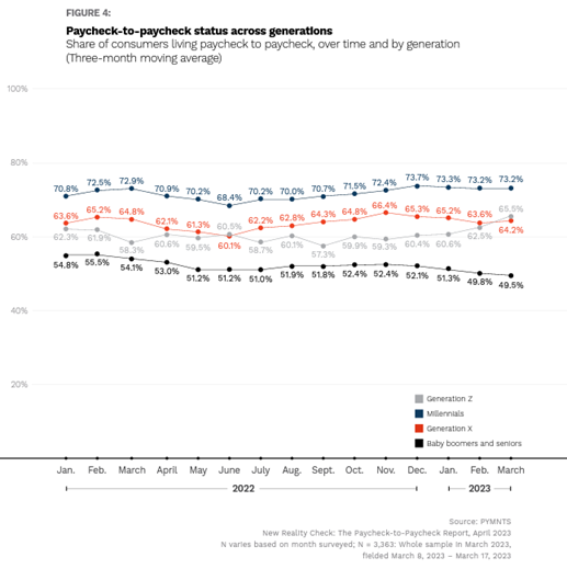 Although one would expect Gen X to have carved out relative financial stability, the above chart illustrates that this generation’s financial lifestyle more resembles Gen Z or millennials than baby boomers and seniors. Members of Generation Z are just starting out in their careers, and it makes sense that around two-thirds would live paycheck to paycheck, but the Gen Z and Gen X lines are fairly intertwined. Moreover, the marker of 64% of Gen X living paycheck-to-paycheck is even potentially a bit misleading, as for most of the time since January 2022, Gen X has demonstrated more financial instability than Gen Z (and thus higher paycheck-to-paycheck numbers). Although theoretically earning more than younger generations in similar employment, it is very likely that their possible increased financial responsibilities may make it much harder for Gen X to get by.