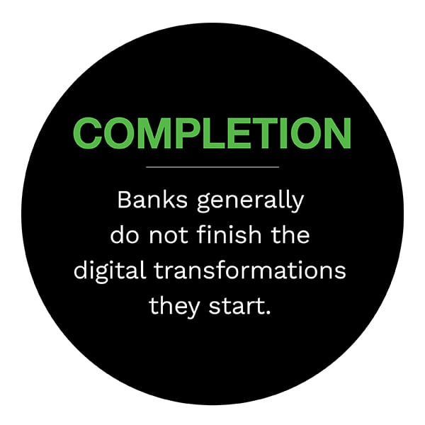 study found that while 80 percent of banks have begun such transformations over the past few years, only 14 percent sustain any performance improvement as a result, and just 3 percent complete their digital shifts. There are several factors that lead to this high rate of attrition, including the persistence of legacy systems as well as the investments necessary to fund these initiatives and train bankers to use new systems.