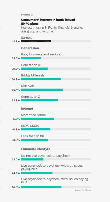 Buy now, pay later (BNPL) plans from FinTechs such as Klarna and Affirm are gaining popularity as shoppers seek alternative financing to avoid rising credit card interest rates. However, PYMNTS research has found that 70% of current BNPL users say they would be interested in BNPL plans offered by their banks. Millennials are more interested in bank-backed BNPL payment plans than any other generation.