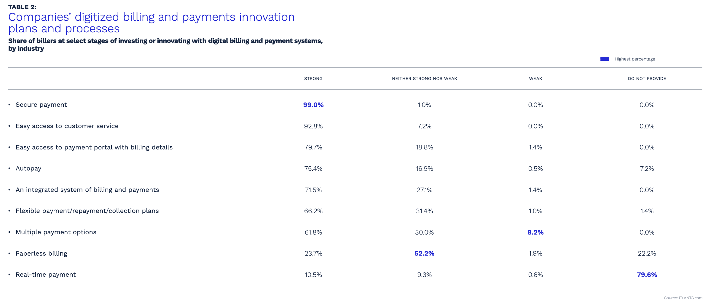 We found that 93% of executives consider ease of access to customer service “a key strength of their digital capabilities, and 80% say the same about payment portals with billing details. In addition, companies say areas like autopay (75%), billing and payment systems integration (71%) and flexible payment, repayment and collection plans (66%) are strong suits. Giving customers a variety of payment options helps ensure that bills get paid on time.”