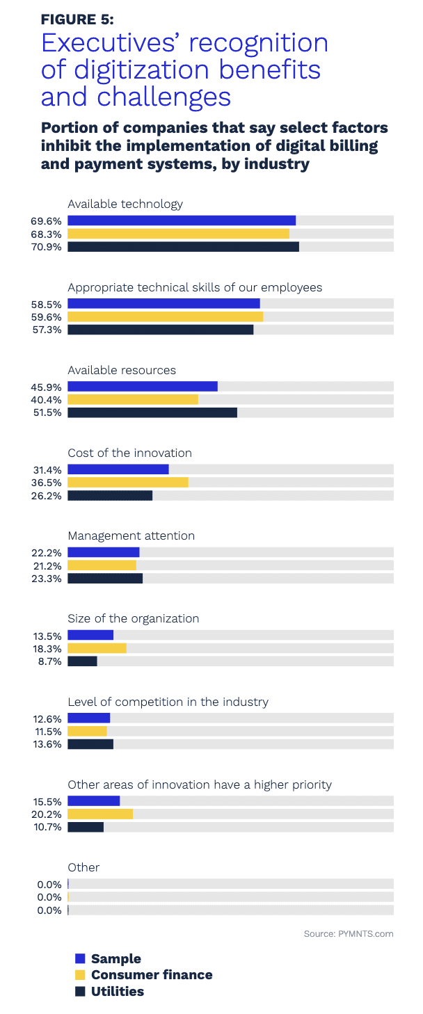 The study states that “companies’ billing and collections executives understand that they may have to overcome serious obstacles to seize the benefits that digitized billing and payments processes offer,” finding that 70% are concerned that needed tech may not be available, and 58% are anxious about internal skills sets, leading more companies to partner in these areas.