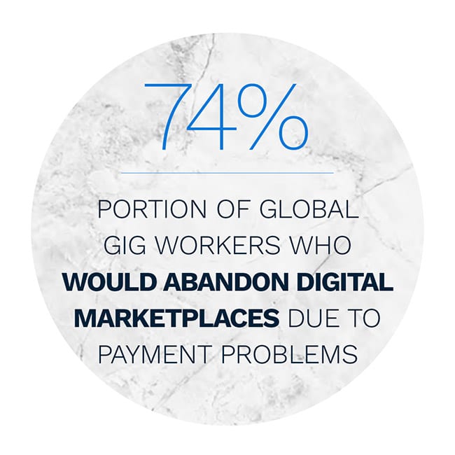 Companies are learning there is no one-size-fits-all approach to delivering payments to gig workers in different markets. For example, direct deposit might not be a viable option for the 1.7 billion adults worldwide who are unbanked. Opportunities to retain global gig workers are also limited, as roughly 74 percent of workers said they would abandon a platform if they experienced payment issues.