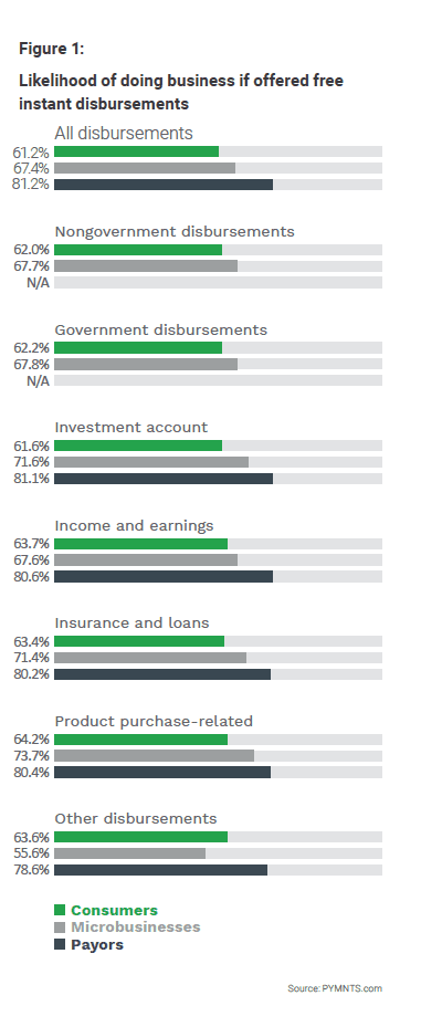 The pandemic has brought instant payments further into the financial spotlight for these groups, and this has not been lost on payors. January 2021 PYMNTS data showed that 81 percent of payors agreed that offering instant disbursements was critical to maintaining client relationships. This looks to be correct, as the study found that only 31 percent of consumers would likely continue their relationships with entities that did not offer such methods.