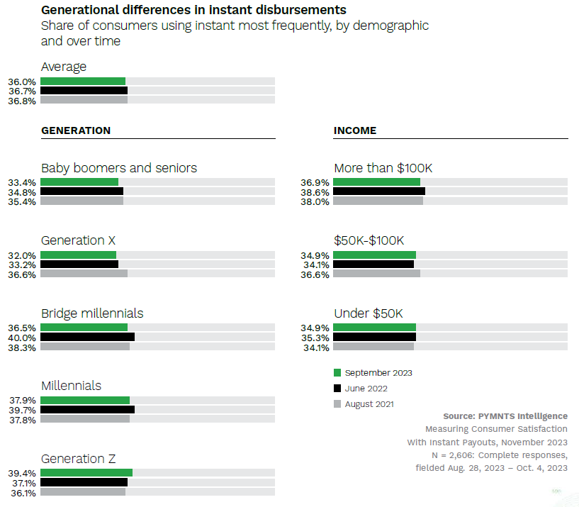 Another key finding captured in the study: the generational disparities in instant payment usage. Generation Z, known for digital savviness, is at the forefront of adopting instant payments, with 39% of this age group receiving disbursements through instant methods this year, marking an increase from 36% in 2021. In contrast, only 32% of Generation X consumers received instant payments this year, a decline from 37% in 2021.