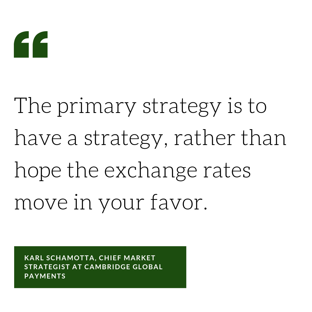 The first step seems obvious, but not obvious enough that it should escape mention. “The primary strategy is to have a strategy,” he said, “rather than hope the exchange rates move in your favor.”