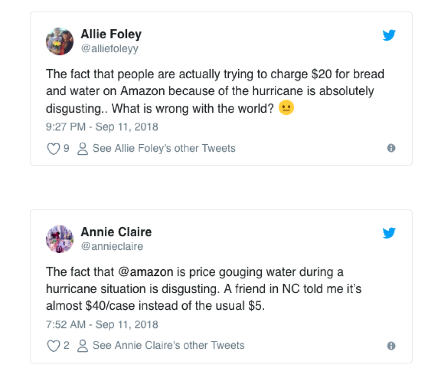 That pre-storm commerce brought the expected rush of the shady and greedy seeking out to take advantage of the alarmed. Reports began popping up midweek that some Amazon sellers were using the opportunity of an encroaching storm to dramatically raise their prices. Consumers complained loudly and angrily on Twitter — and while Amazon noted that they do not set prices for their marketplace sellers, they were looking into the issue.