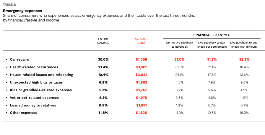 “At 30%, car repairs are the most common unexpected expense, and consumers paid an average of $1,008,” the study stated. “The next-most common expenses are health-related, with 21% of consumers facing at least one health-related emergency expense and spending an average of $1,361. Housing- and relocation-related expenses had the highest average cost at $2,042,” faced by 19% of consumers.