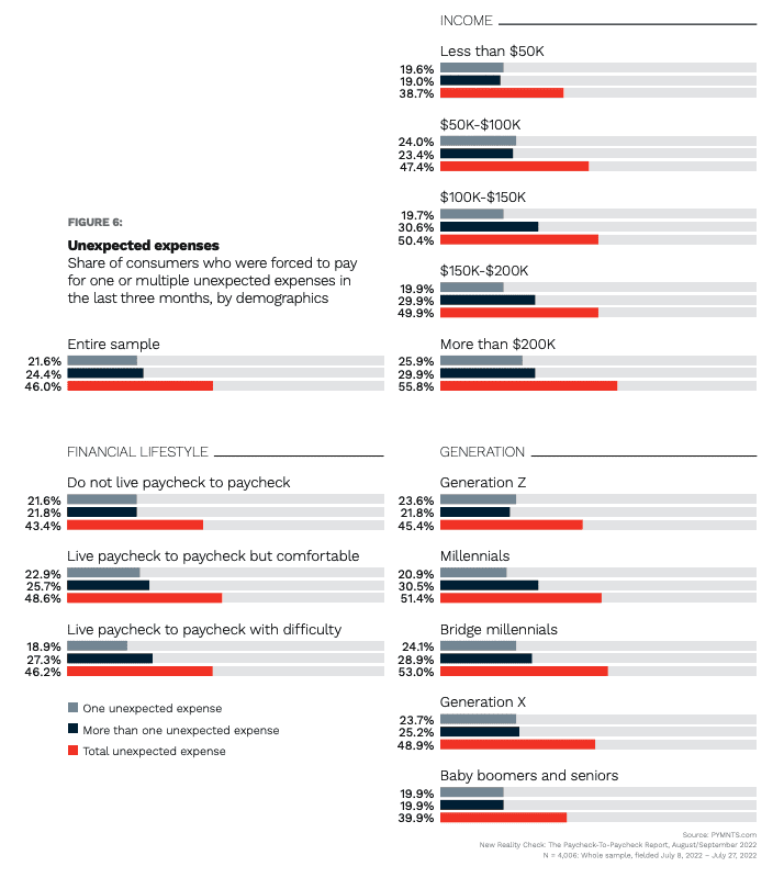 “Fifty-three percent of bridge millennials and 51% of millennials faced unexpected expenses in the last 90 days, just 45% of Generation Z consumers and 40% of baby boomers and seniors did so,” the study stated. “Also, 56% of consumers annually earning more than $200,000 had to pay at least one emergency expense, whereas 39% of those annually earning less than $50,000 had to do the same. Higher-income consumers were more likely to face more than one unexpected expense.”