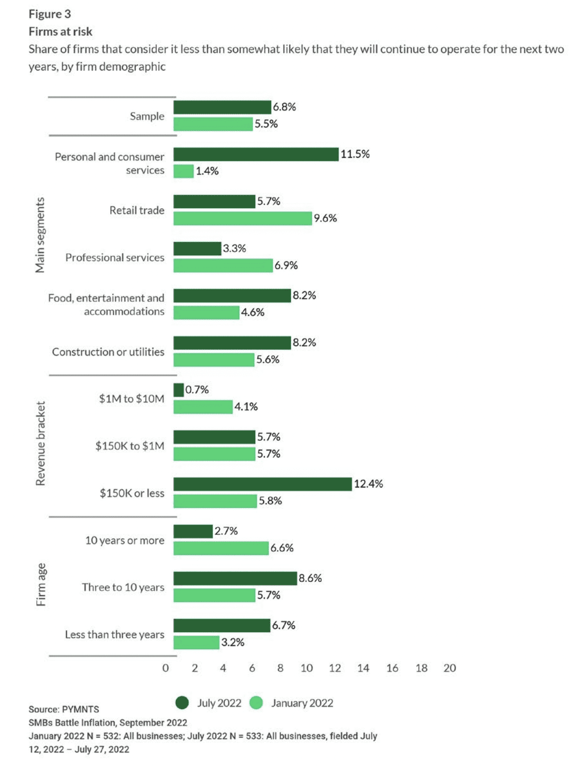 Research from PYMNTS’ study “Main Street Health Q3 2022: SMBs Battle Inflation,” which drew from a July survey of 533 United States businesses, found that the share of businesses in the food, entertainment and lodging sectors that consider it “less than somewhat likely” that they will continue to operate for the next two years surged from 4.6% to 8.2% between January and July.
