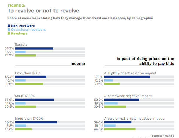 The data show that the highest and lowest-earning brackets are the ones that revolve their credit card debt most significantly — and thus they have less dry powder to spend. As seen in the accompanying chart, the impact of rising prices is decidedly negative. Our estimates show that 55% of consumers with bank-issued credit cards always, or usually, pay their card balances in full each month, while 45% — approximately 89 million consumers — carry revolving balances.