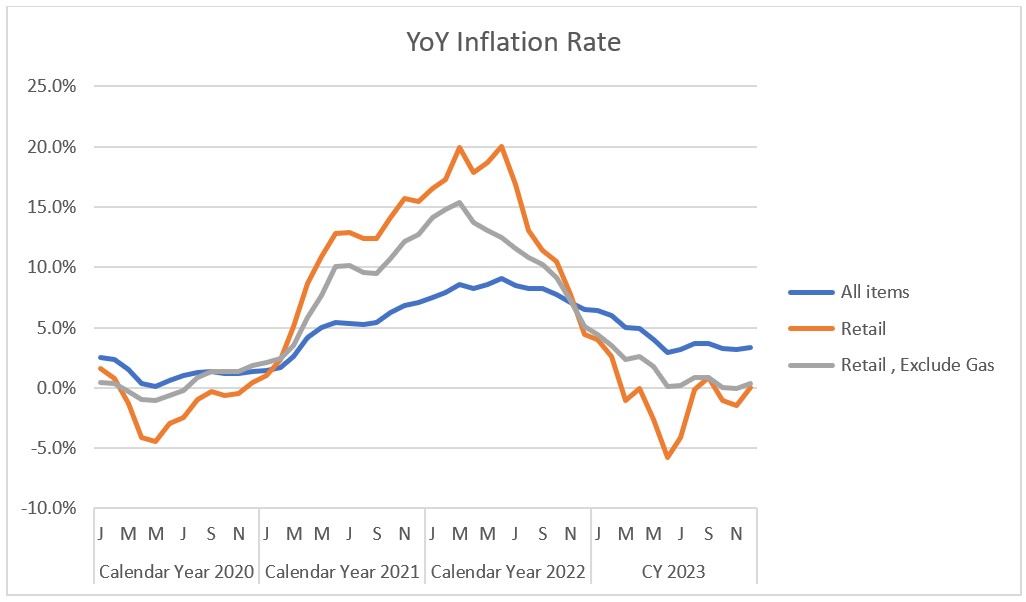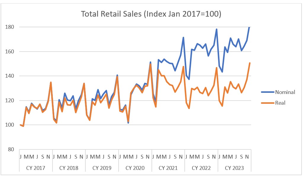 Part of the reason for the surge — and the narrowing of the gap between real and nominal sales — lies with the fact that inflation for retail items (not overall) has been near 0%, though volatility reigns.