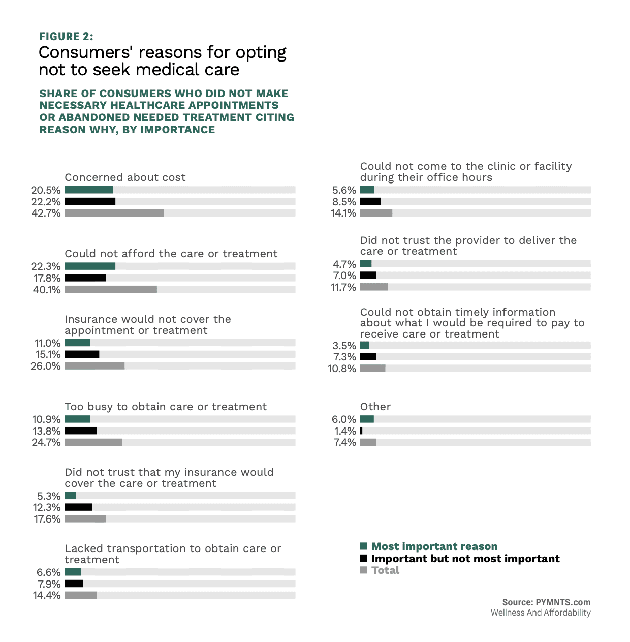 Affordability and cost are the top reasons behind this. Among the consumers who did not make necessary healthcare appointments or abandoned needed treatment, 22% said the most important reason was that they could not afford the care or treatment, and 21% said it was that they were concerned about cost.