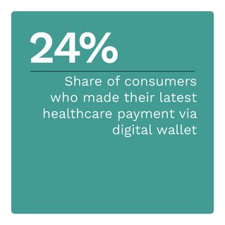 • The economy’s digital transformation has helped make digital wallets the third-most common payment method in the healthcare space, behind only credit and debit cards. Twenty-four percent of all consumers used digital wallets to make their most recent healthcare payment.
