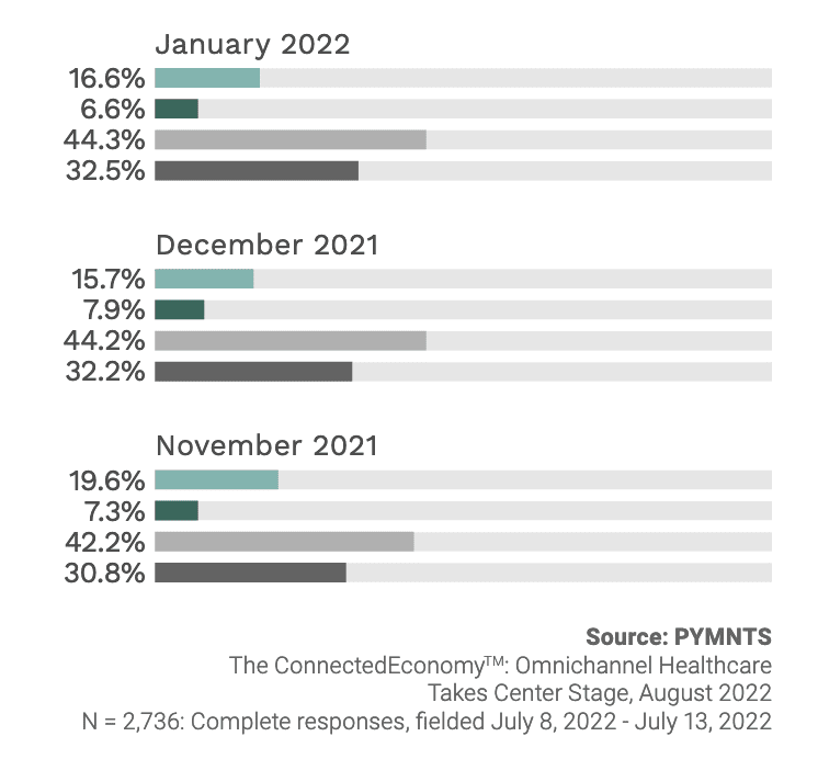 Noting that 46% of U.S. consumers engage with healthcare providers using both physical and digital channels, the study states, “This means consumers are using a mix of both in-person and online healthcare channels — as opposed to one or the other — 8% more than they did in November. Similarly, 25% fewer consumers used only digital channels and 11% fewer used only brick-and-mortar channels last month than just one month prior.”