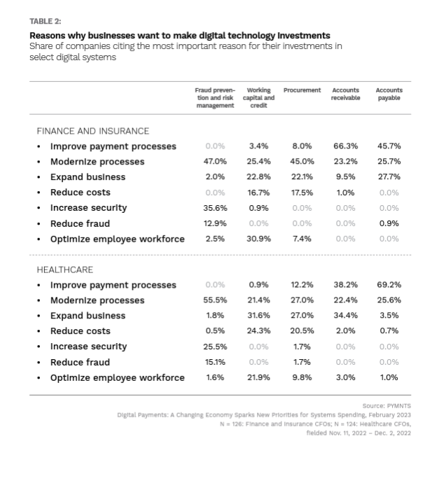 For healthcare CFOs, cost reduction is a primary driver for increased investment in digital technology to streamline systems, including accounts receivable, accounts payable, procurement and working capital platforms. Cutting out needless employee hours in reconciliation that may be better applied with more meaningful tasks could improve efficiencies and fill out part of the debt gap some facilities are facing.