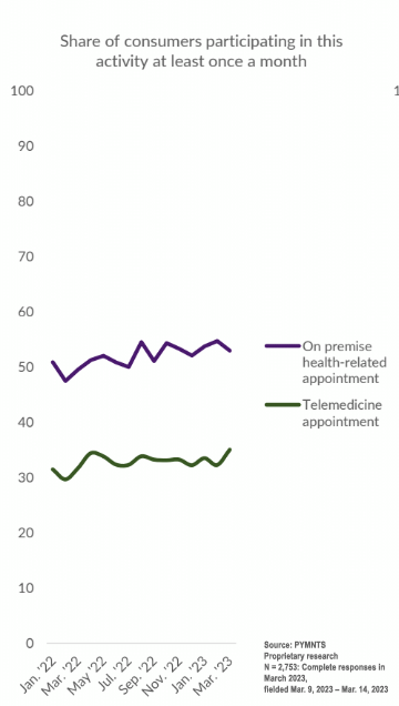 Consumer participation in telehealth during this time period ranges between approximately 30% and 40%, not far below the roughly 50% share with monthly in-person visits. Both figures held relatively stable throughout 2022 and 2023, albeit with telehealth trending up and physical visits trending down over the most recent months.