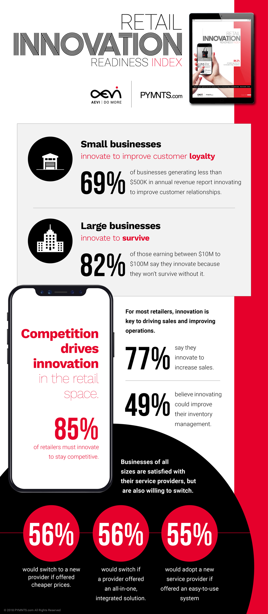 Easier said than done, of course, especially for smaller businesses (SMBs) — the PYMNTS-AEVI report surveyed more than 400 retailers across nine different sectors to gauge innovation readiness. There is still an innovation divide that is based on company size. That may carry a whiff of obviousness, but recent changes — again, mainly via digital retail, payments and marketing tools — make that divide seem different than it might have a generation ago.