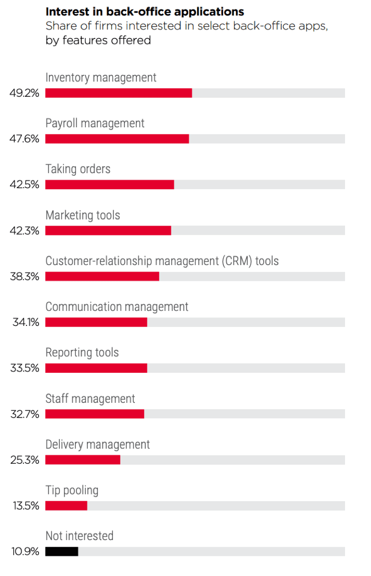 Behind the scenes, consumer services firms are most interested in apps that can facilitate inventory management (49.2 percent) and payroll management (47.6 percent).