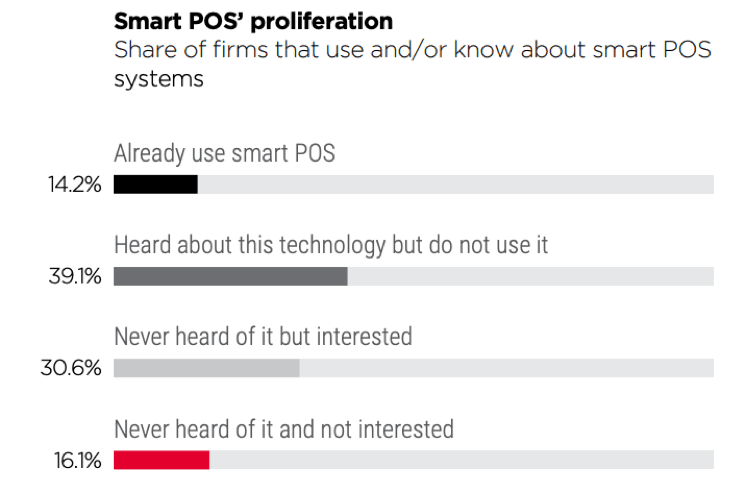 Smart POS systems can offer the desired consumer-facing features, while also helping back-office operations. Yet smart POS adoption among the consumer services segment is fairly low. Only 14.2 percent already use a smart POS system, and 16.1 percent weren’t familiar with them and weren’t interested.