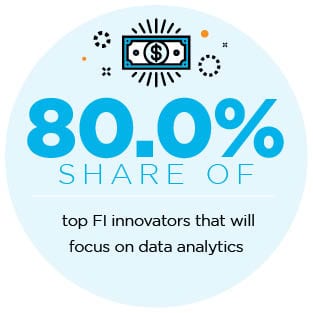 Data analytics, which leverages AI and other sophisticated computational tools to enable banks to make better decisions about which new products and features to develop, is also a key priority for top-performing FIs. Our research shows that 80 percent of them will focus on data analytics, far surpassing lower-performing FIs. All FIs, however, will make data analytics a greater priority in the coming years. In fact, the share of bottom performers that plan to innovate in this area is projected to grow by more than 166 percent over the next three years.