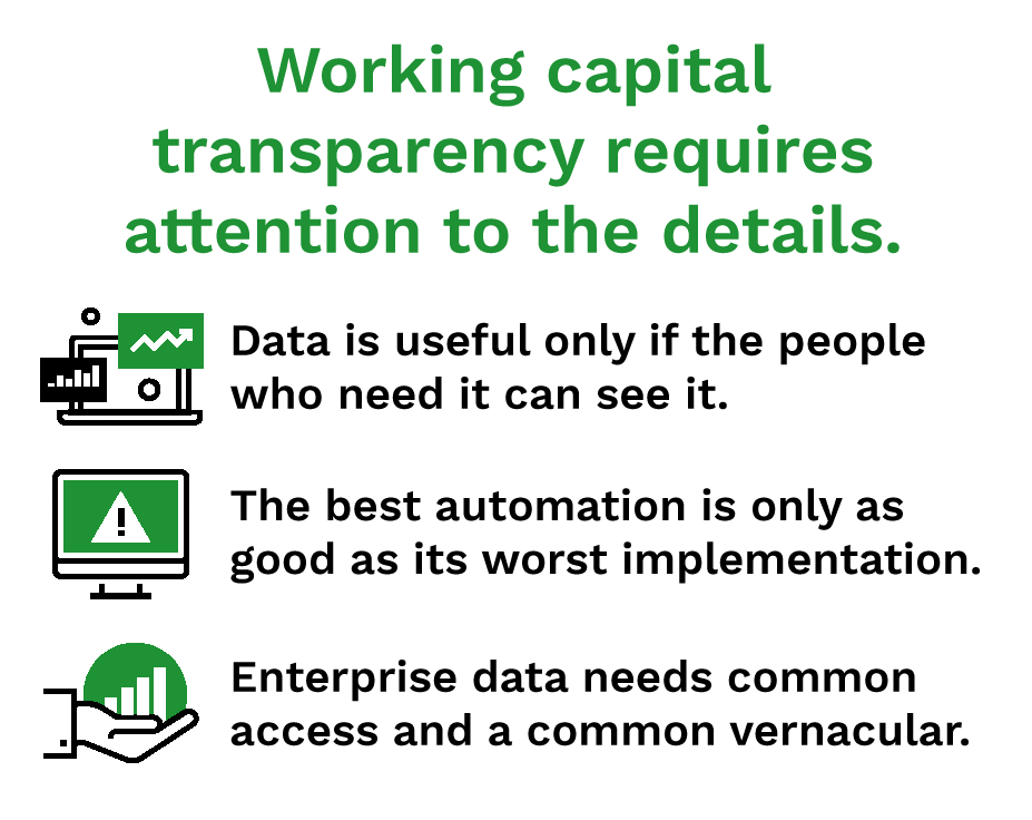 A great product is still only as good as its implementation. Katz said that how well automation software works still depends a lot on the organization deploying it. Simply implementing a system without diligent and deliberate testing can even make the situation worse for working capital transparency. On the other hand, if teams are connected and everyone understands the software, automation can be a significant boon for productivity. Just as with any system, it comes down to ensuring that data is shared rather than siloed and that the people on the ground are invested in and understand the tools they are using.
