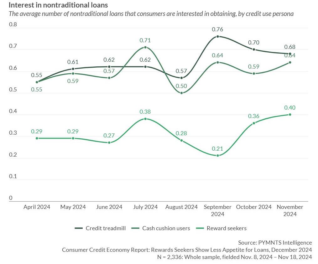 When it came to pursuing new loans, reward seekers showed the least interest, looking for an average of 0.34 traditional loans and 0.4 nontraditional loans. In contrast, credit treadmill consumers showed higher interest, desiring 0.43 traditional loans and 0.68 nontraditional loans on average. Cash cushion users also showed interest, with an average of 0.43 traditional loans and 0.64 new nontraditional loans.