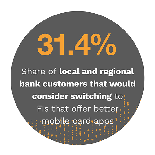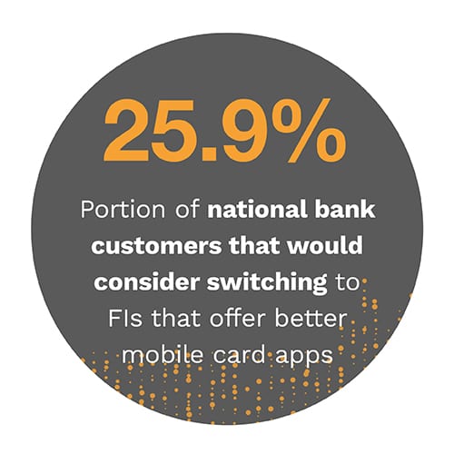 Our research shows that 28.5 percent of cardholders would be at least somewhat likely to switch to FIs that offer superior mobile card apps — and these levels are higher among those whose primary debit or credit cards were issued by local and regional banks. Among this group, 31.4 percent would be at least somewhat likely to switch FIs in pursuit of better card apps. In contrast, national bank customers are less likely to switch FIs, with 25.9 percent of them somewhat or more likely to do so.