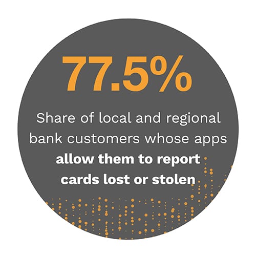 Our research reveals that different types of banks are in different places when it comes to delivering the specific app features consumers want. For example, 90.3 percent of national bank cardholders report that their card apps allow them to set preferences for notifications and alerts, compared to 82.3 percent of local and regional FI cardholders that report the availability of this feature. Another popular feature — reporting cards lost or stolen — is offered by 86.2 percent of national banks, versus 77.5 percent of local and regional banks, according to respondents. Overall, national banks offer 6.9 separate app features on average, while digital banks offer seven and local and regional offer 6.6.