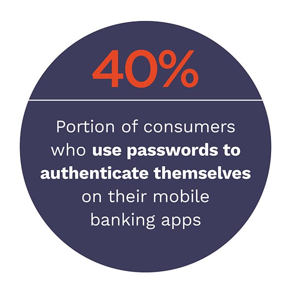 ecognition, security questions, one-time passwords, phone numbers, facial identification, PINs, fingerprint scans, email addresses and passwords. Forty percent of consumers use passwords to authenticate themselves on their mobile banking apps, making it the most commonly leveraged authentication method, and 82 percent are “very” or “extremely” satisfied with this option. Voice-based authentication and security questions, on the other hand, are the least satisfying authentication methods, with 34 percent and 33 percent of users being “somewhat” or less satisfied with these options, respectively.