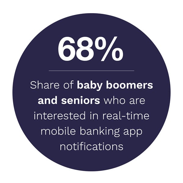 nalized user experience is especially high among credit union (CU) members, who would use their apps more if they offered more functionalities. Twenty-four percent say they would like to be able to retrieve their credit scores, and 58 percent say they would like their banking apps to send them real-time notifications of account activity. In terms of generational breakdowns, baby boomers and seniors are the most interested demographic: 68 percent say they would be interested in receiving real-time notifications, compared to only 45 percent of Generation Z consumers who say the same.