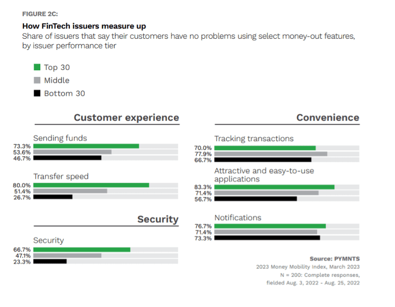 More than three-quarters of these FinTech issuers say their customers have issues with money-out security. Among the leaders, only one-third report these difficulties. Such a large gap when it comes to security satisfaction from better-performing sector competitors would be concerning at any time. However, in today’s digital banking world, consumers value security over convenience, meaning this inadequacy could spark a customer exodus in search of issuers providing better data protection.