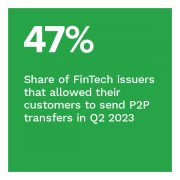 P2P transfers for money-in and money-out transactions are the most popular services among consumers, with 51% and 44% of consumers, respectively, using them. We found that 47% of FinTech respondents reported they allow consumers to send P2P transfers and 41% allow consumers to receive these transfers, representing increases of 10 percentage points for sending and 9 percentage points for receiving since Q3 2022.