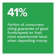 Nearly all FinTech issuers believe that their customers encounter issues when depositing or transferring funds, yet they fail to properly identify where consumers have trouble when doing so. Among consumers who reported issues when depositing money into their accounts, 41% said that the guarantee of good funds/speed was the issue they faced most often, while 28% cited the guarantee of good funds/speed as the issue they experienced most often when moving funds out of their accounts.